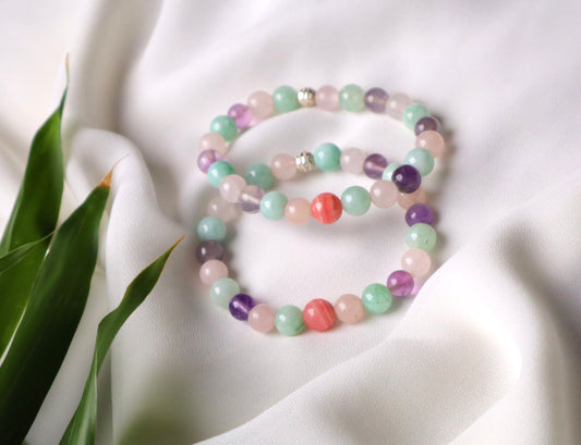 Rose Quartz, Amethyst, Purple Agate, Aquamarine, Rhodochrosite, and Pink Jade Supreme Benefits Bracelet